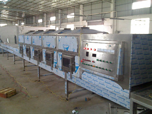 用于粉狀、顆粒狀物料的干燥脫水。常規加熱如火焰、熱風、蒸汽干燥等都是利用熱傳導的原理,將熱量從被加熱物外部傳入內部,逐步使物體中心溫度升高,稱之為外部加熱。要使中心部位達到所需要的溫度需要一定的時間,導熱性較差的物體所需時間就更長。這些傳統的干燥方法時間長、耗電量大,加熱不太均勻,上下翻動,勞動強度大,而微波能干燥特點,微波能穿透物體內部里外同時加熱,頻率為2450MHZ,以每秒24億5千萬次的振蕩,水分子也同樣是萬次的振蕩,分子之間互相摩擦產生熱量,自身發熱。所以可廣泛用于化工產品的分裝物料的干燥脫水。例如:草酸鈷、氫氧化鋰、氫氧花鎳、甘露純、仲鎢酸銨、鈷酸鋰、碳酸鋇、碳酸鋰、